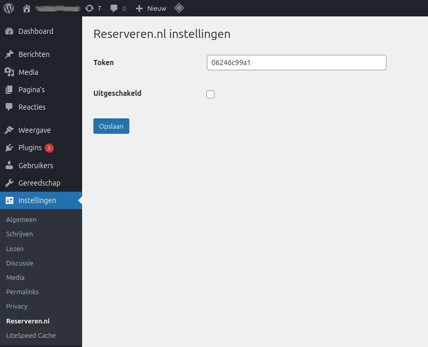 • Vul het reserveren.nl token in op de pagina onder WP Admin > Instellingen > Reserveren.nl (zie onderstaande screenshot)